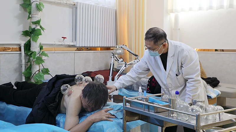 中医师为老人进行拔罐理疗