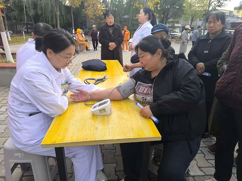 活动在陕北大秧歌表演中拉开序幕。社区及各共建单位代表向老人们致以诚挚问候,传递社会对老年群体的重视与关爱。随后,工作人员为到场老人发放米、面、油、雨伞、毛巾被、棉马甲等慰问品,物资实用贴心,精准贴合秋日生活需求。榆林市第五医院工作人员还现场为老年人免费量血压,讲解秋季健康防护知识。针对瘫痪等行动不便的老人,社区专程安排慰问小组上门送物资、唠家常。