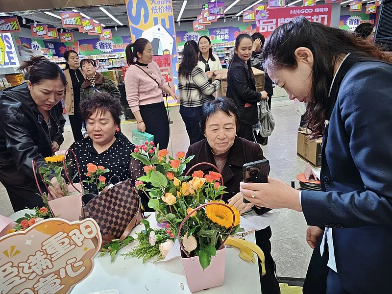 活动在精彩的歌舞表演中拉开帷幕,老人们一边欣赏节目,一边品尝着甜蜜的重阳糕点,在志愿者的指导下制作了寓意吉祥的茱萸花束,场面温馨融洽。现场还设置了义诊区,老人们有序排队测量血压、检测血糖,医护人员耐心问诊并提供专业的医疗建议。同时,银行工作人员以案说法进行反诈宣传,帮助老人们提高防范意识。活动还特别布置了专门的重阳节主题拍照打卡区,为老人们记录下美好瞬间。