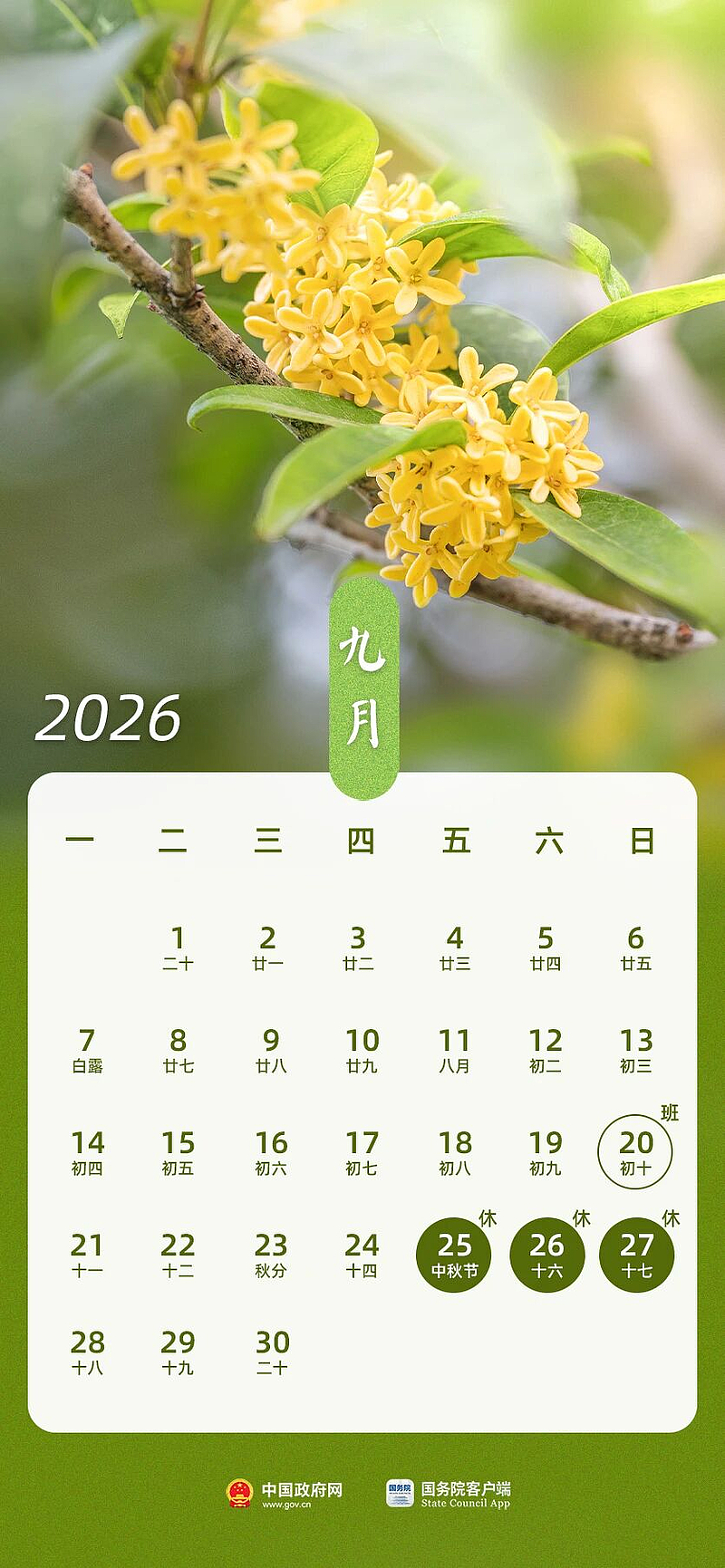 六、中秋节:9月25日(周五)至27日(周日)放假,共3天。
