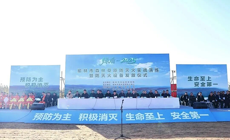 11月11日,“绿盾—2025”榆林市森林草原防灭火实战演练暨防灭火设备发放仪式在榆阳区补浪河女子民兵治沙连举行。