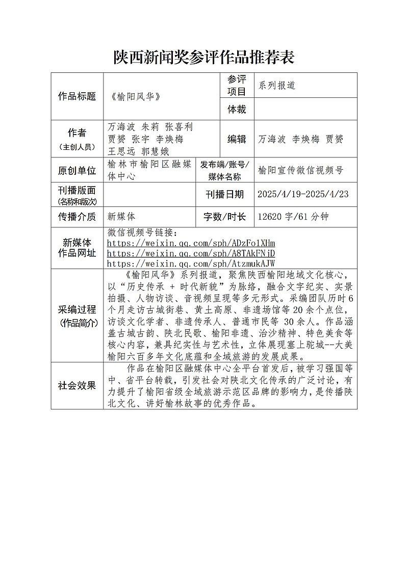 (后附陕西新闻奖参评作品推荐表)