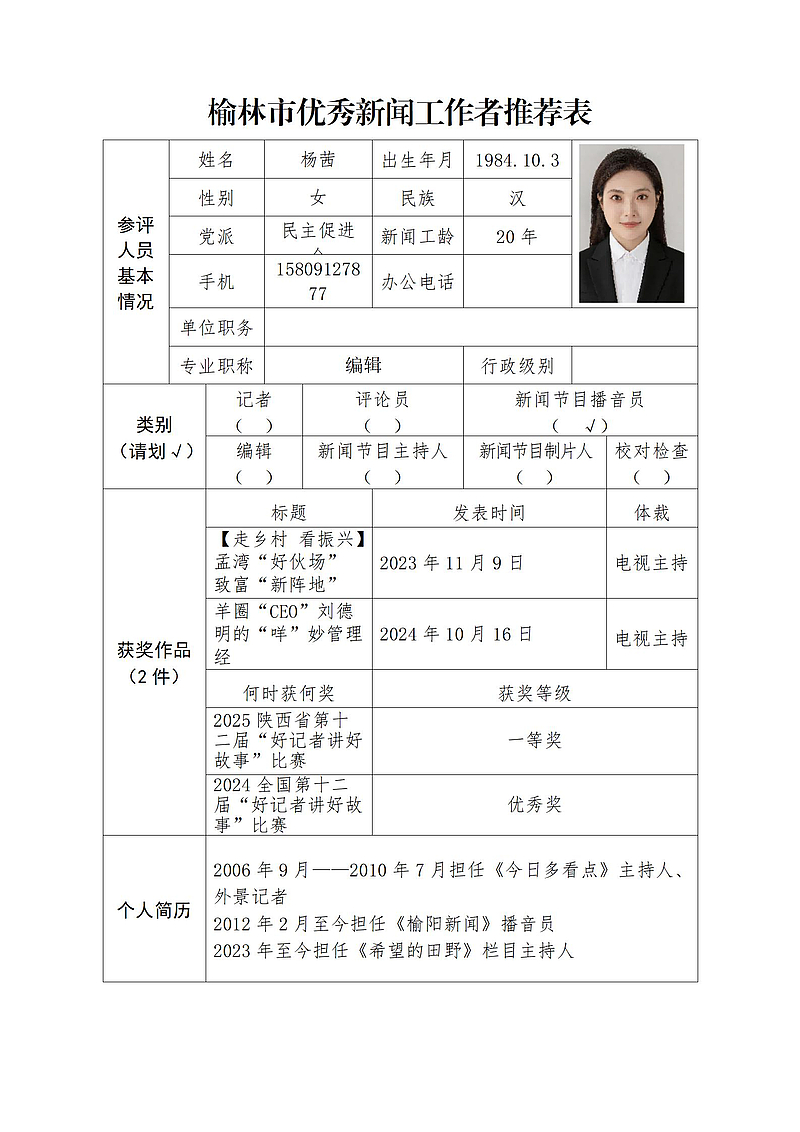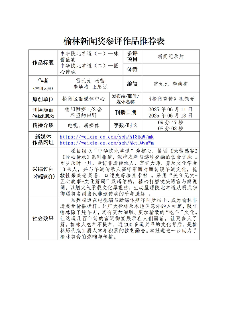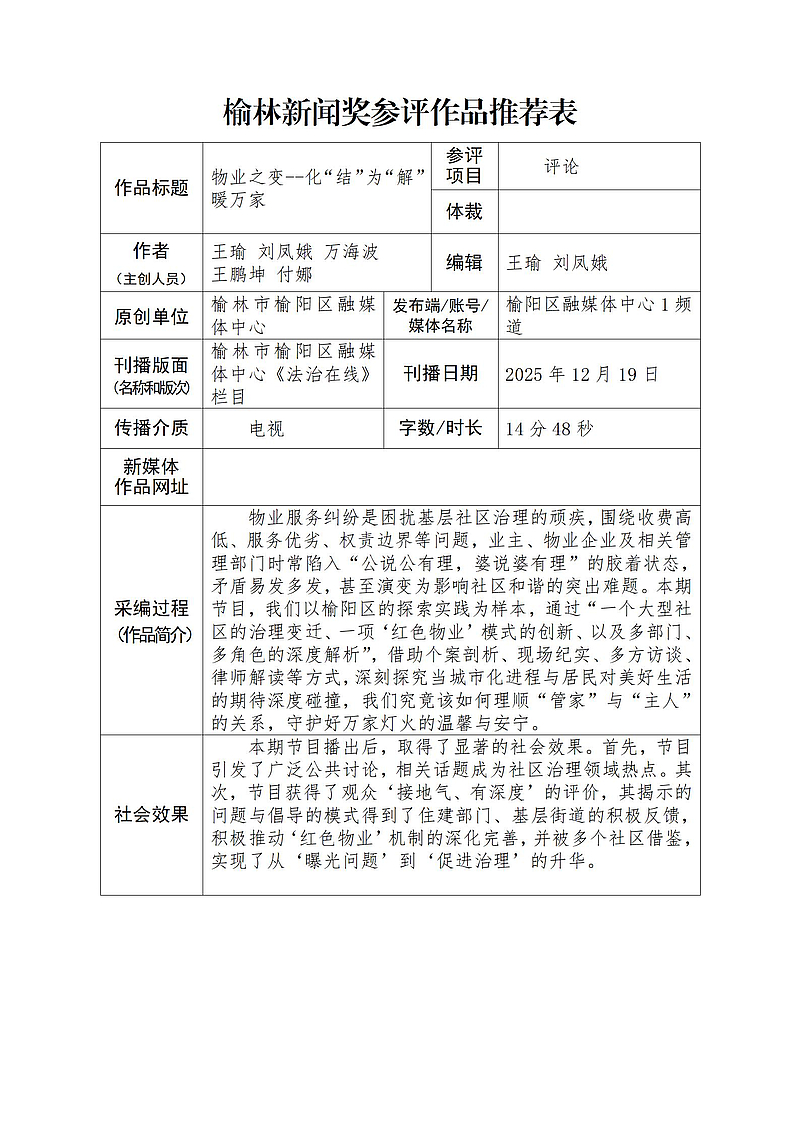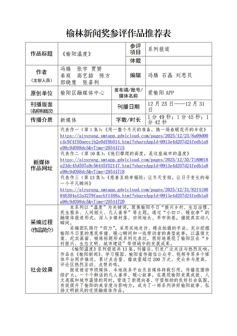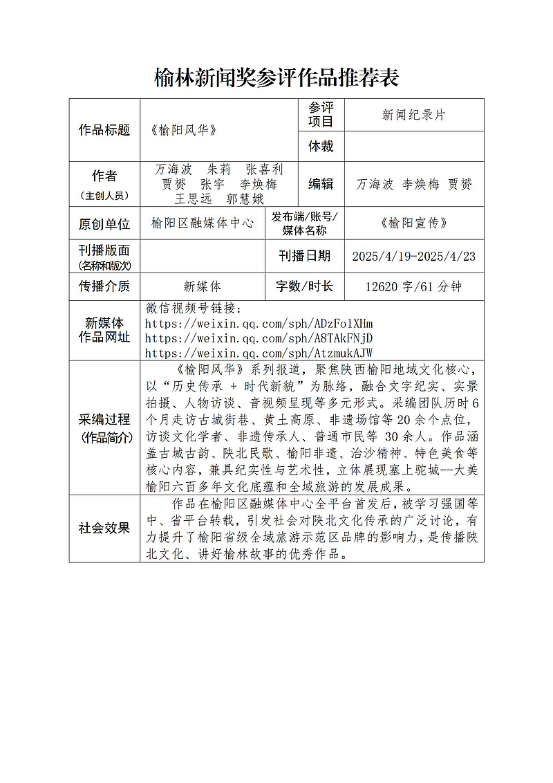 (后附榆林新闻奖参评作品推荐表)