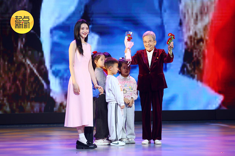 △路生梅讲述完毕,演员刘浩存牵着小朋友们为路奶奶送上鲜花。