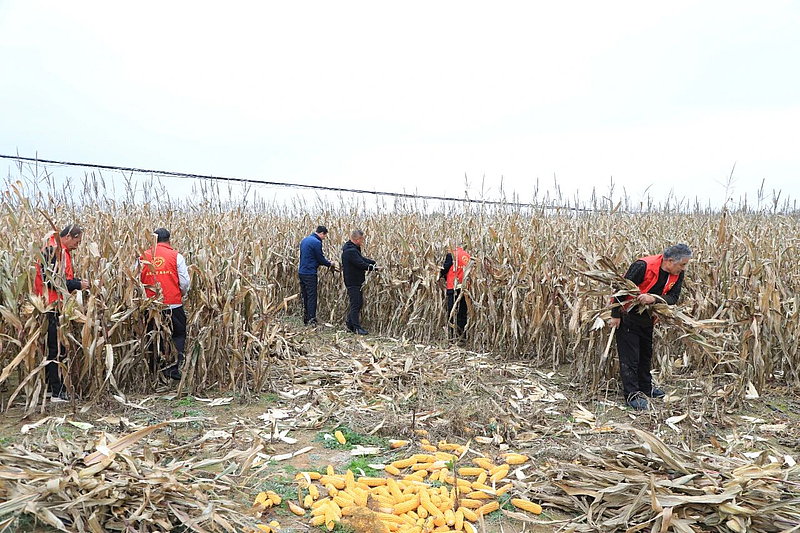 在古塔镇黄家圪崂村农户马克瑞的玉米地里,亮眼的“红马甲”格外醒目,这是党员先锋队正在开展助农秋收工作。为抢抓农时,队员们与农户并肩作战,大家分工明确、动作麻利,掰玉米、割秸秆、装袋、转运,各环节衔接有序,抢收工作高效推进,田间一派繁忙的丰收景象。