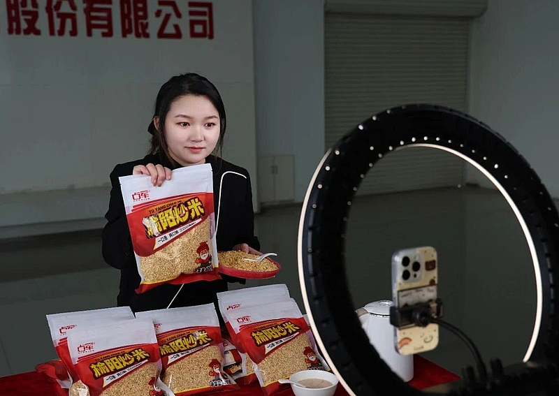 在公司直播区,谢园园正通过直播带货推介产品,现场将炒米倒入奶茶中搅拌演示,详细介绍产品种类,吸引不少网友关注下单。作为集研发、生产、销售于一体的食品企业,榆林市占军食品股份有限公司不仅专注炒米品质提升,还积极创新杏仁系列产品,研发推出杏核、杏仁、杏片、杏干四类产品,以丰富的品类矩阵,持续为消费者提供高品质、健康化的特色食品。