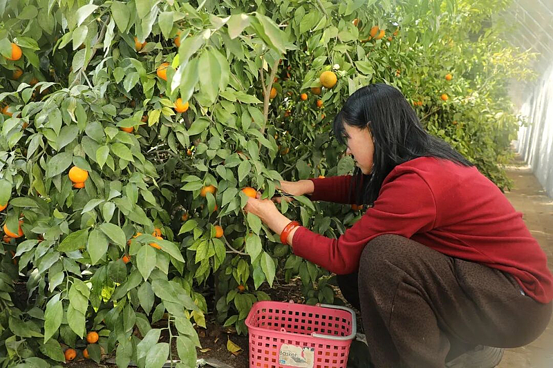 “橘生淮南则为橘,生于淮北则为枳”。但在鱼河镇郑家沟村谢艳霞家庭农场的设施大棚里,柑橘已经在此扎根。橘子树枝繁叶茂,沉甸甸的“红美人”橘子挂满枝头,金黄饱满、果香四溢,迎来了一场“甜蜜盛宴”。种植户谢艳霞在大棚里开启直播,用朴实的语言向大家介绍橘子的口感,并现场采摘发货,让客户尽快吃到自然成熟的新鲜水果。