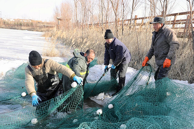 上午十点,冬捕正式进入收网环节。经验丰富的渔民身着专业防寒装备,精神饱满、有条不紊地投入到作业当中。大家分工协作、配合默契,细致整理渔网、检查接口,各环节配合默契,随着渔网缓缓出水,网中鲜鱼欢腾跳跃,银鳞映光、活力十足,现场欢呼声此起彼伏,尽显丰收的喜庆与祥和。