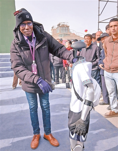 | 在第十一届新疆特色果品(阿克苏)交易会开幕式上,巴尔德与人形机器人互动。 受访者供图 |