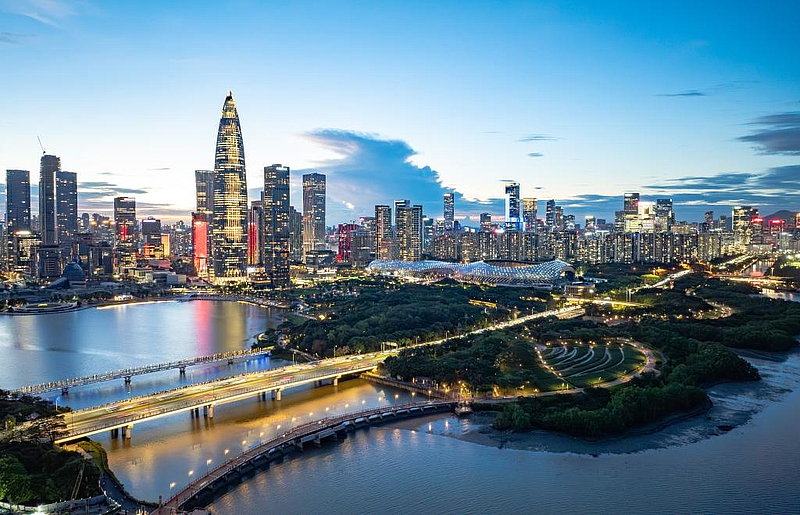 夜幕初上的深圳后海片区。(无人机照片,2025年6月25日摄)新华社记者 毛思倩 摄