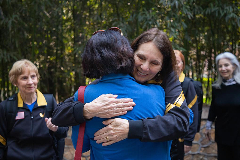 4月8日,在北京大学,美方“乒乓外交”亲历者朱迪·霍尔弗罗斯特与中方亲历者郑敏之在重逢时热情拥抱。