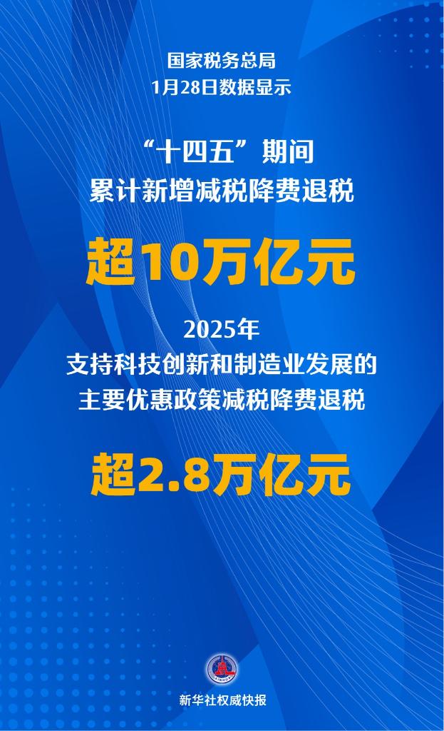 新华社权威快报丨“十四五”期间我国累计新增减税降费退税超10万亿元 2026-01-28记者1月28日从全国税务工作会议上获悉,在经济增长等因素带动下,2025年,税务部门全年征收各项税费33.1万亿元,税费收入预算目标圆满完成。落实支持科技创新和制造业发展的主要优惠政策减税降费退税超2.8万亿元。“十四五”期间,税务部门累计征收税费超156万亿元,约占全口径财政收入的80%;累计新增减税降费退税超10万亿元,为经营主体发展壮大提供了有力支持。
