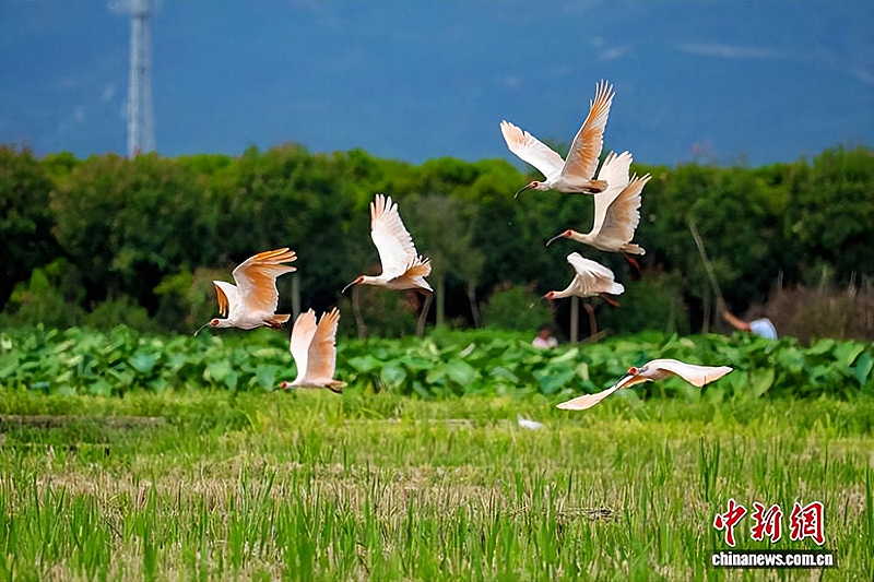 朱鹮成群飞过陕西汉中的稻田。李吉安 摄