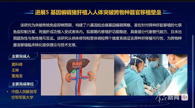 空军军医大学此次入选的成果为“基因编辑猪肝植入人体突破跨物种器官移植壁垒”。大学相关负责人表示,该研究为突破传统免疫抑制局限,构建了六基因组合猪基因编辑策略,首创针对异种肝脏移植的七联免疫抑制方案,将猪肝成功植入受试者体内。观察期内移植肝功能稳定、具备部分代谢替代能力,且未出现超急性与急性排斥反应。该研究从供体修饰和受体调控两个维度系统证实异种肝移植可行性,为跨物种器官移植临床转化提供理论与技术支撑。