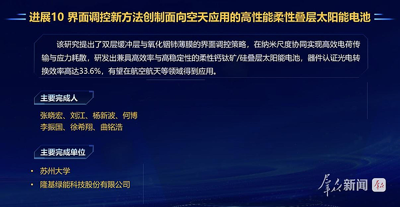 隆基绿能科技股份有限公司此次入选的成果,是与苏州大学联合报送的“界面调控新方法创制面向空天应用的高性能柔性叠层太阳能电池”。隆基绿能科技股份有限公司相关负责人表示,该研究提出了双层缓冲层与氧化铟铈薄膜的界面调控策略,在纳米尺度协同实现高效电荷传输与应力耗散,研发出兼具高效率与高稳定性的柔性钙钛矿/硅叠层太阳能电池,器件认证光电转换效率高达33.6%,有望在航空航天等领域得到应用。