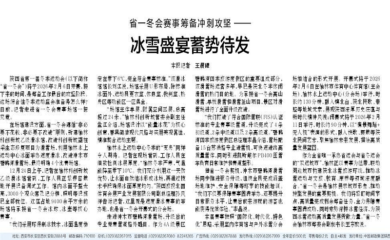 省一冬会赛事筹备冲刺攻坚—— 冰雪盛宴蓄势待发 2025-12-29陕西省第一届冬季运动会(以下简称“省一冬会”)将于2026年2月6日开幕,接下来的时间,是筹备工作最后的攻坚阶段。这场综合性冬季运动盛会准备得怎么样?日前,记者走进省一冬会赛事场馆一探究竟。