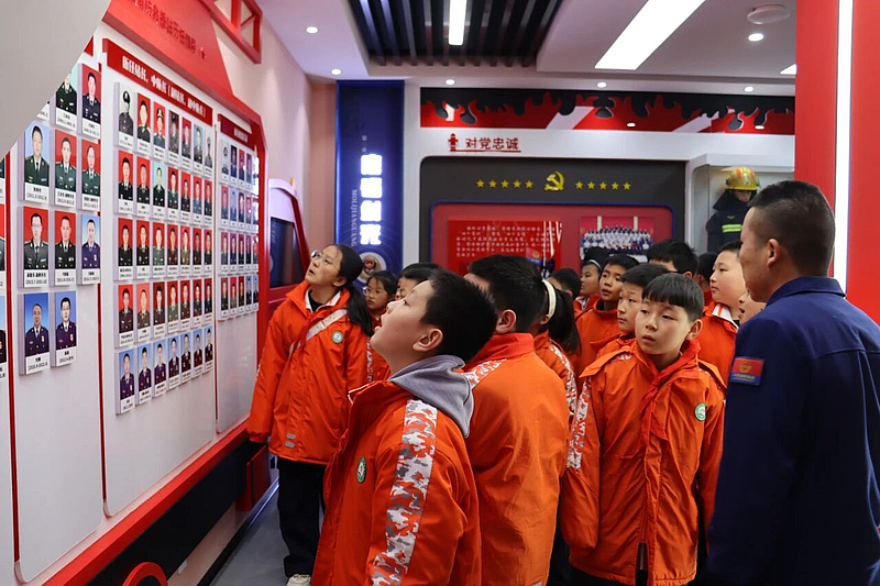 活动尾声,学生们走进消防救援人员的宿舍。当看到叠得方方正正、棱角分明的“豆腐块”被子时,孩子们忍不住拍手叫好。消防救援人员现场演示叠被子的步骤,从铺平被面、压实边角到捏出棱角,每个动作都细致规范,还耐心讲解操作要领,引导学生们将“精益求精、严于律己”的作风融入日常学习生活。随后,大家参观了区消防救援大队的荣誉室,消防救援人员通过一张张救援现场照片、一个个沉甸甸的奖杯奖牌,深情讲述背后的救援事迹,让孩子们深刻感悟“火焰蓝”忠诚担当、无私奉献的使命与担当。