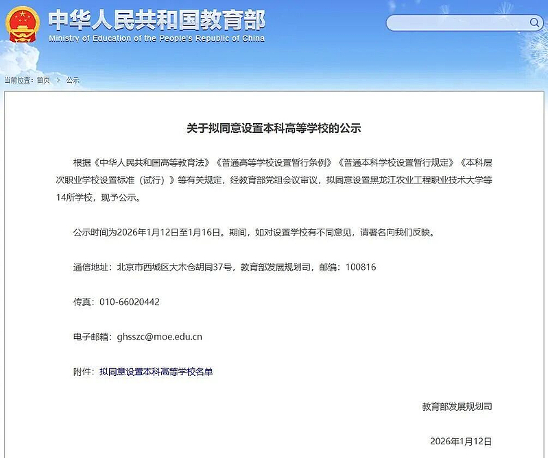 1月12日,教育部发布《关于拟同意设置本科高等学校的公示》,拟同意包括榆林学院更名为榆林大学在内的14所学校设置。